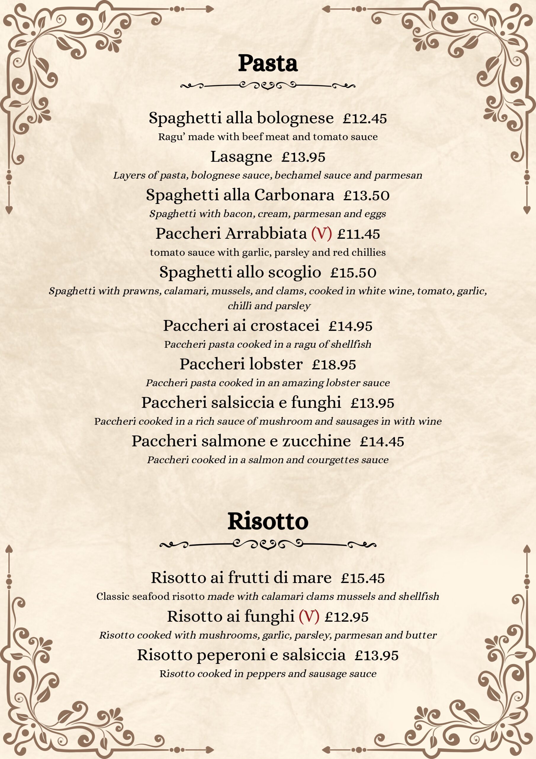 At Luigi’s Restaurant, we bring the heart of Italy to your table with fresh, handmade dishes crafted from the finest ingredients. From traditional pasta and seafood to wood-fired pizzas and decadent desserts—experience a culinary journey like no other.